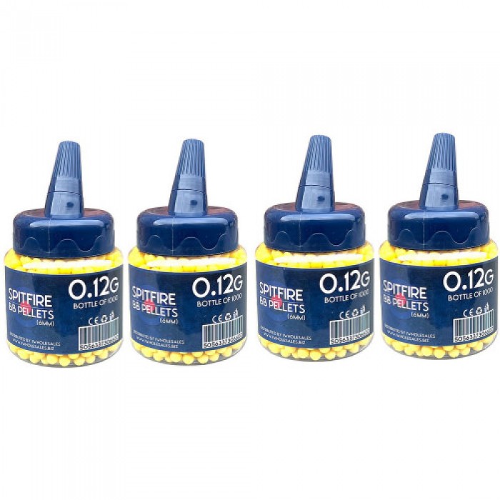 4 Tub of 1000 Spitfire Seamless Yellow 0.12g Plastic 6mm BB Gun Pellets.  Multiple Quantity Discounts Available.  These BB Gun Pellets are excellent and weigh 0.12g per pellet.   Yellow in Colour.   4000 Pellets in Total.